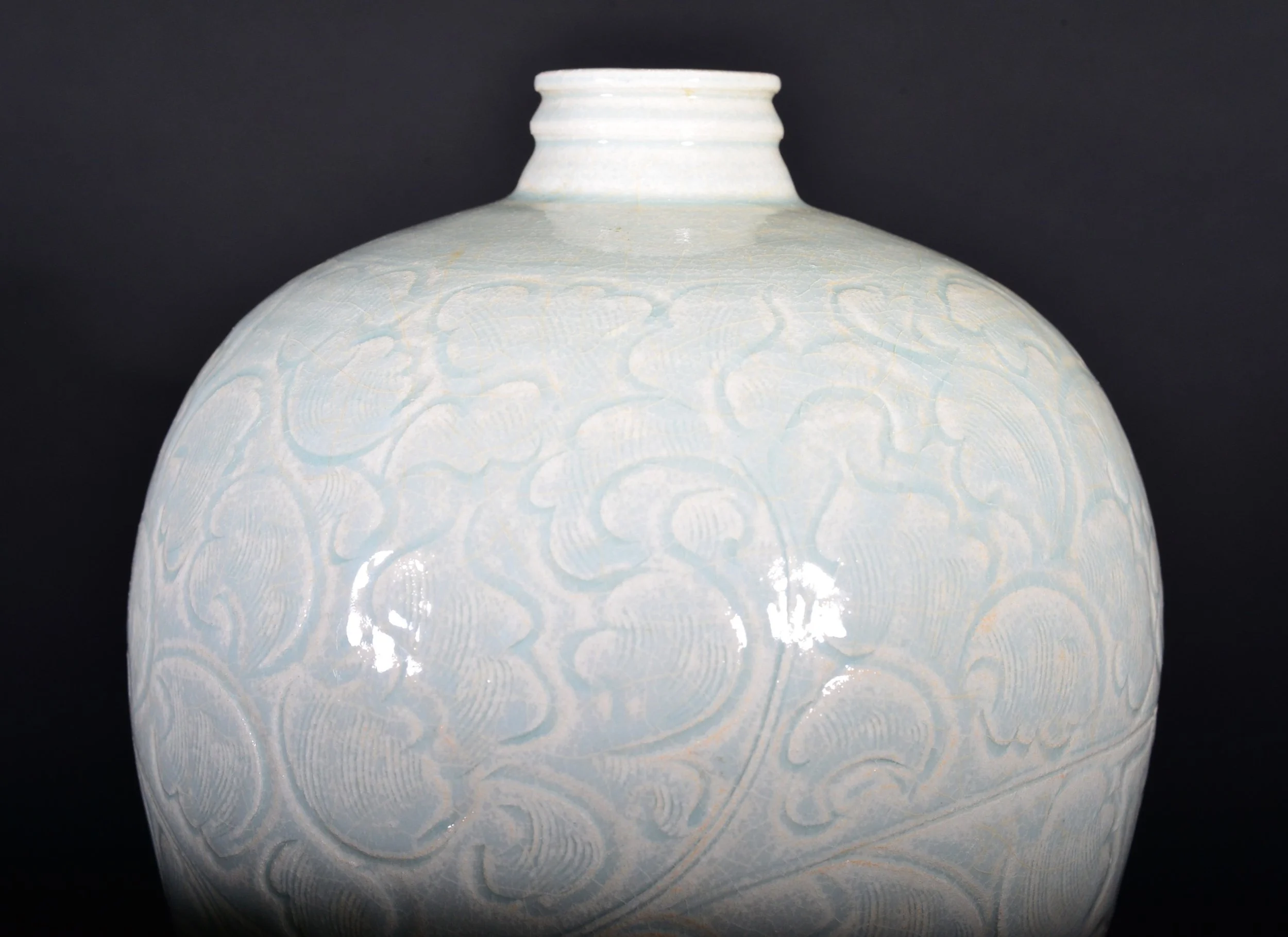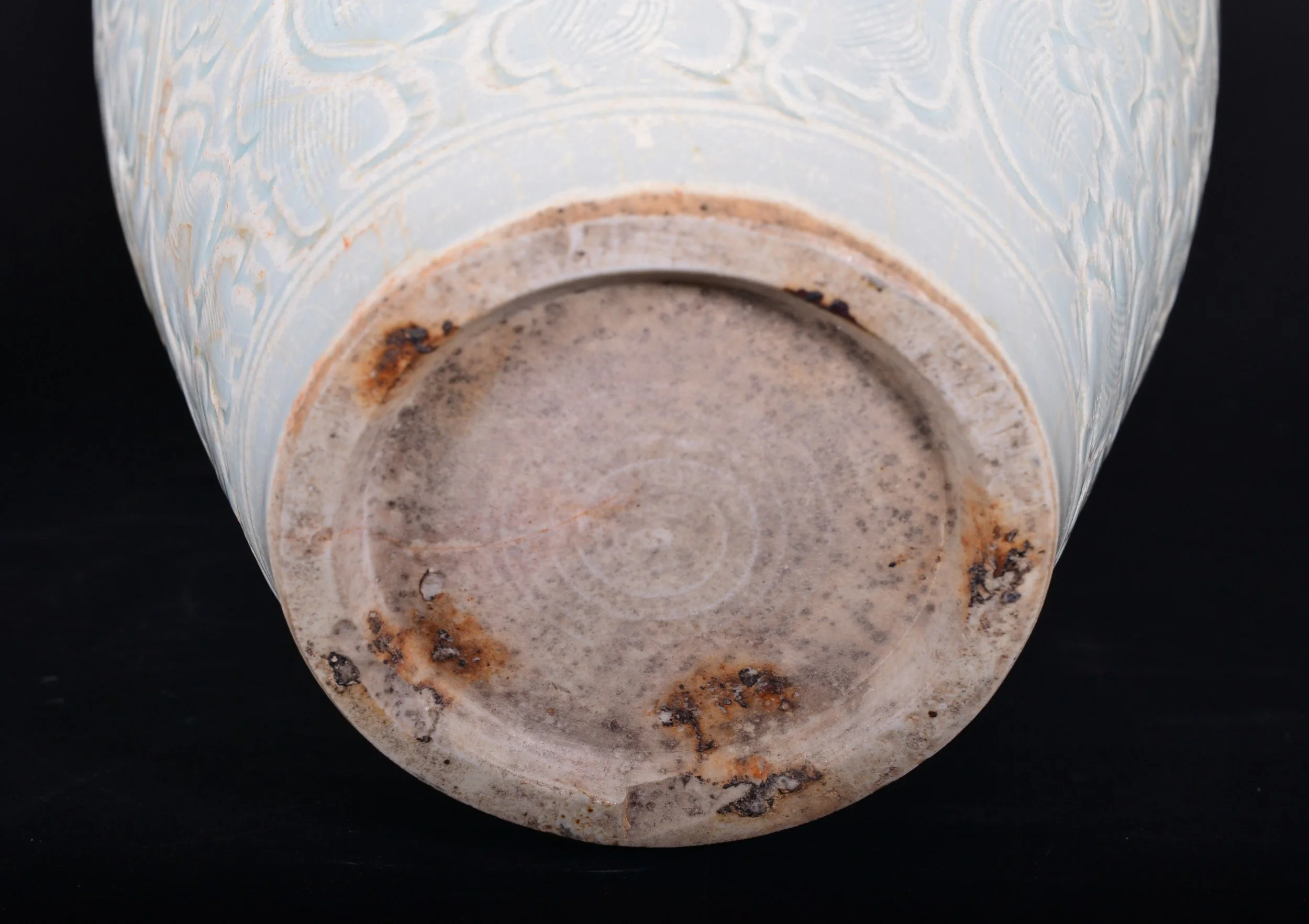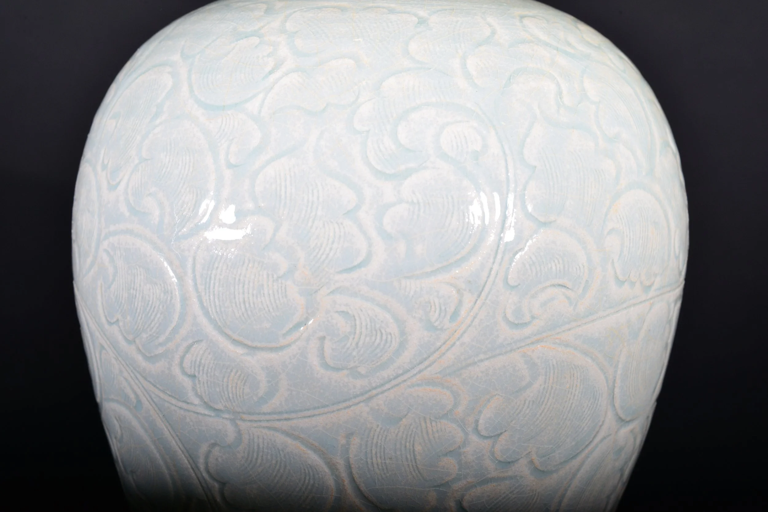 Finely crafted structure, characterized by its wide shoulders and elongated, tapering sides, topped with a compact, ribbed cylindrical neck. Its exterior is adorned with intricately carved scrolling foliage motifs, accentuated by meticulously combed incisions. A delicate bluish glaze envelops the vase, with the entire surface embellished with elegantly incised patterns of leafy vines and flourishing lotus flowers.