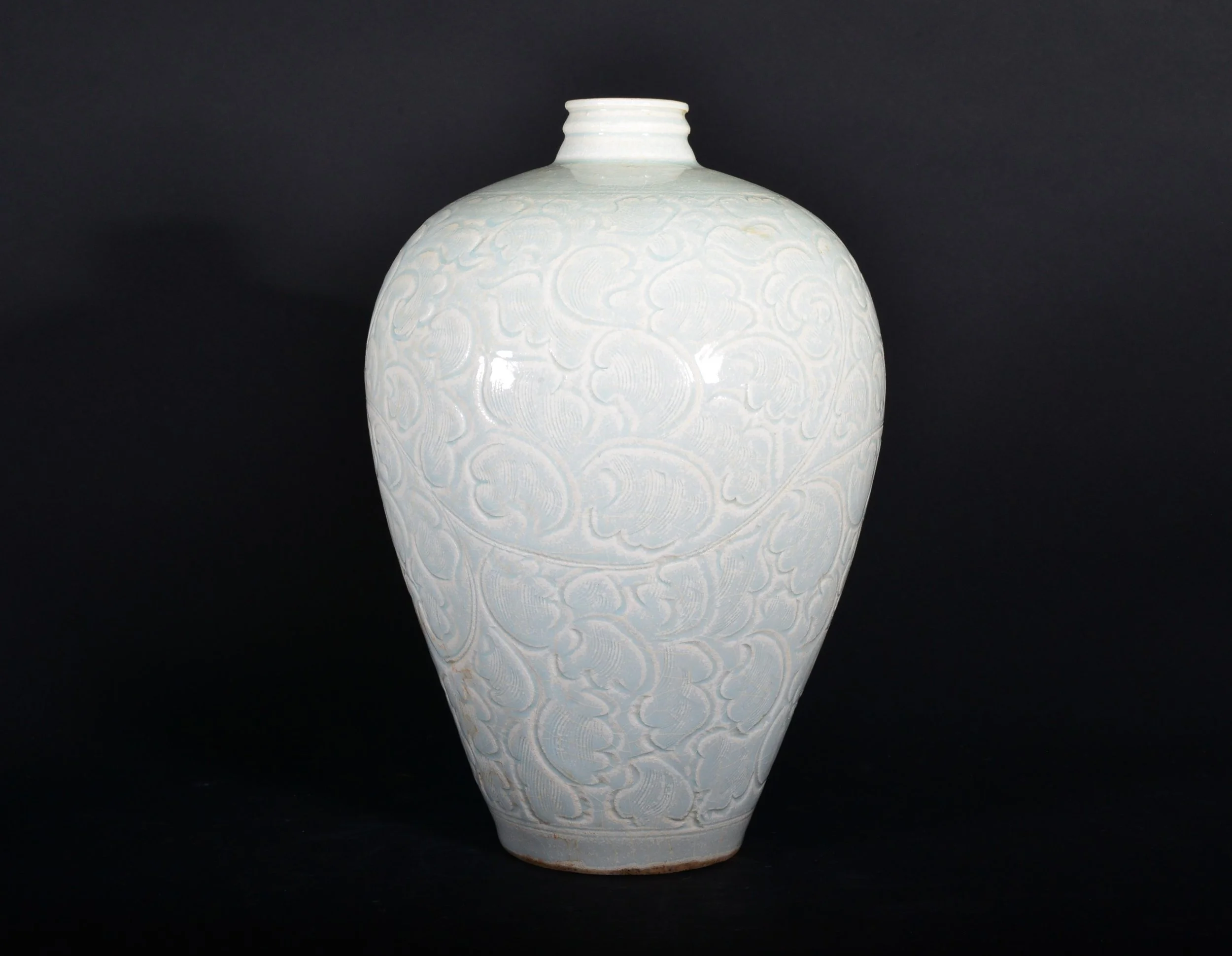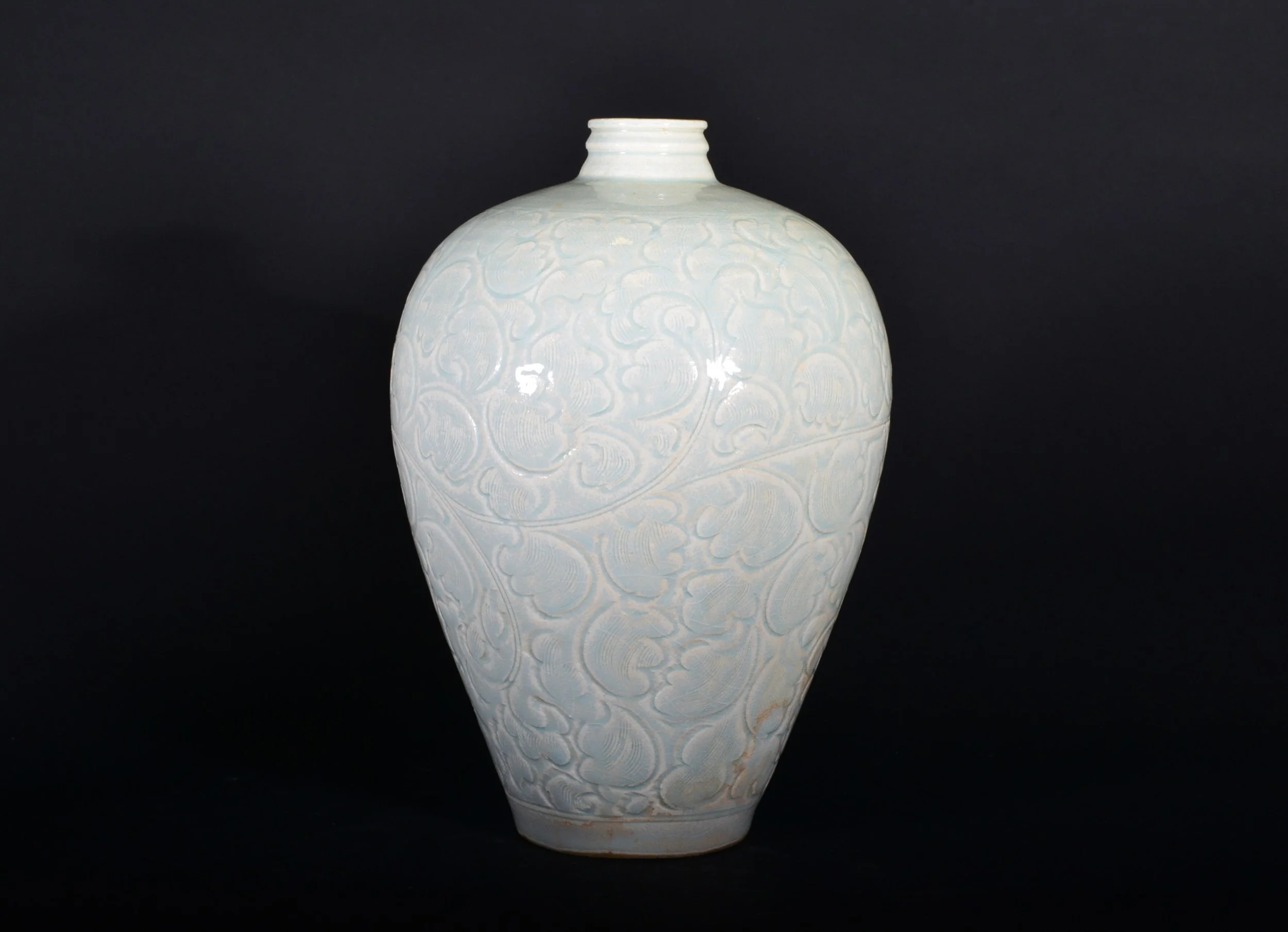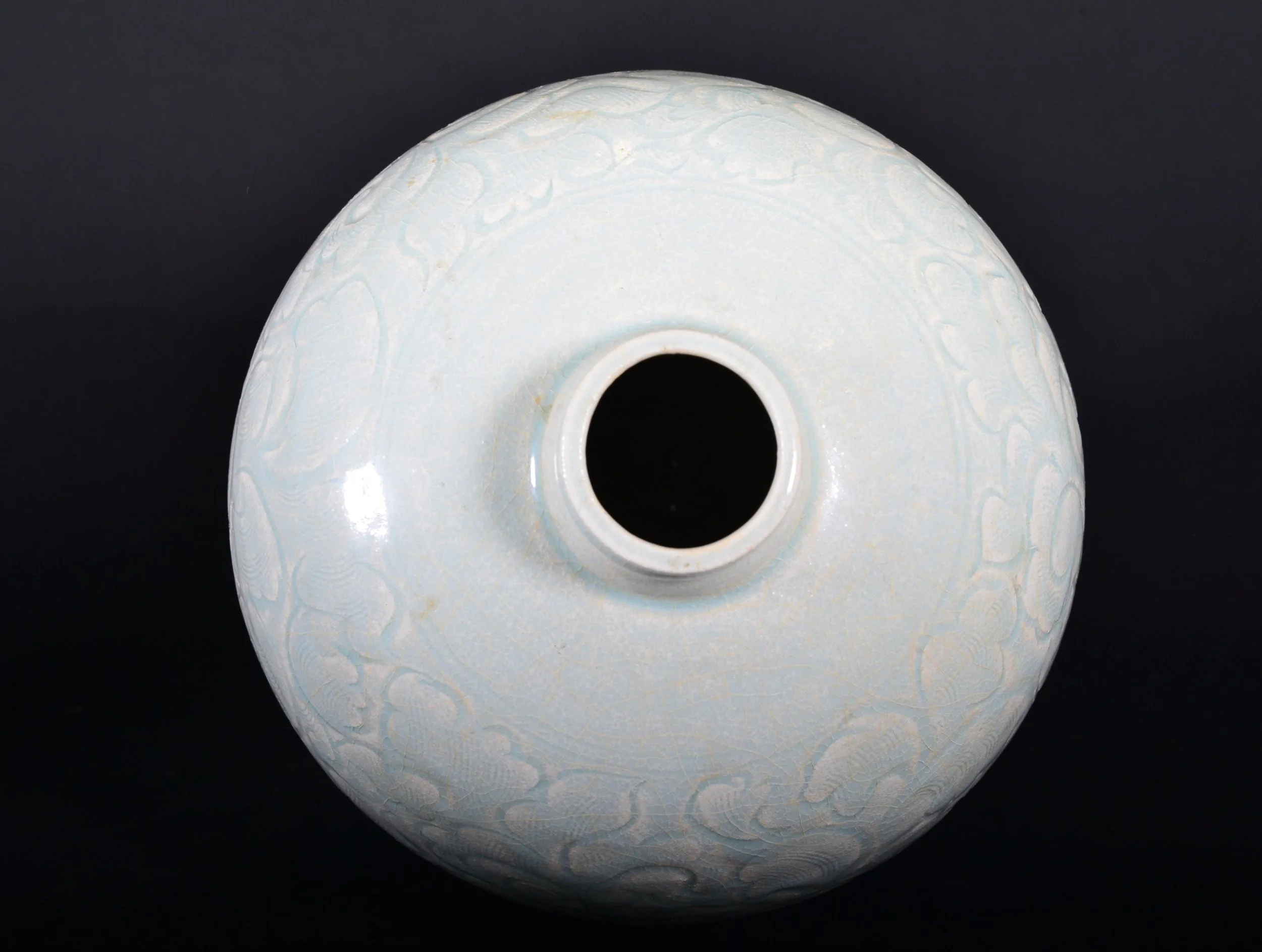Finely crafted structure, characterized by its wide shoulders and elongated, tapering sides, topped with a compact, ribbed cylindrical neck. Its exterior is adorned with intricately carved scrolling foliage motifs, accentuated by meticulously combed incisions. A delicate bluish glaze envelops the vase, with the entire surface embellished with elegantly incised patterns of leafy vines and flourishing lotus flowers.