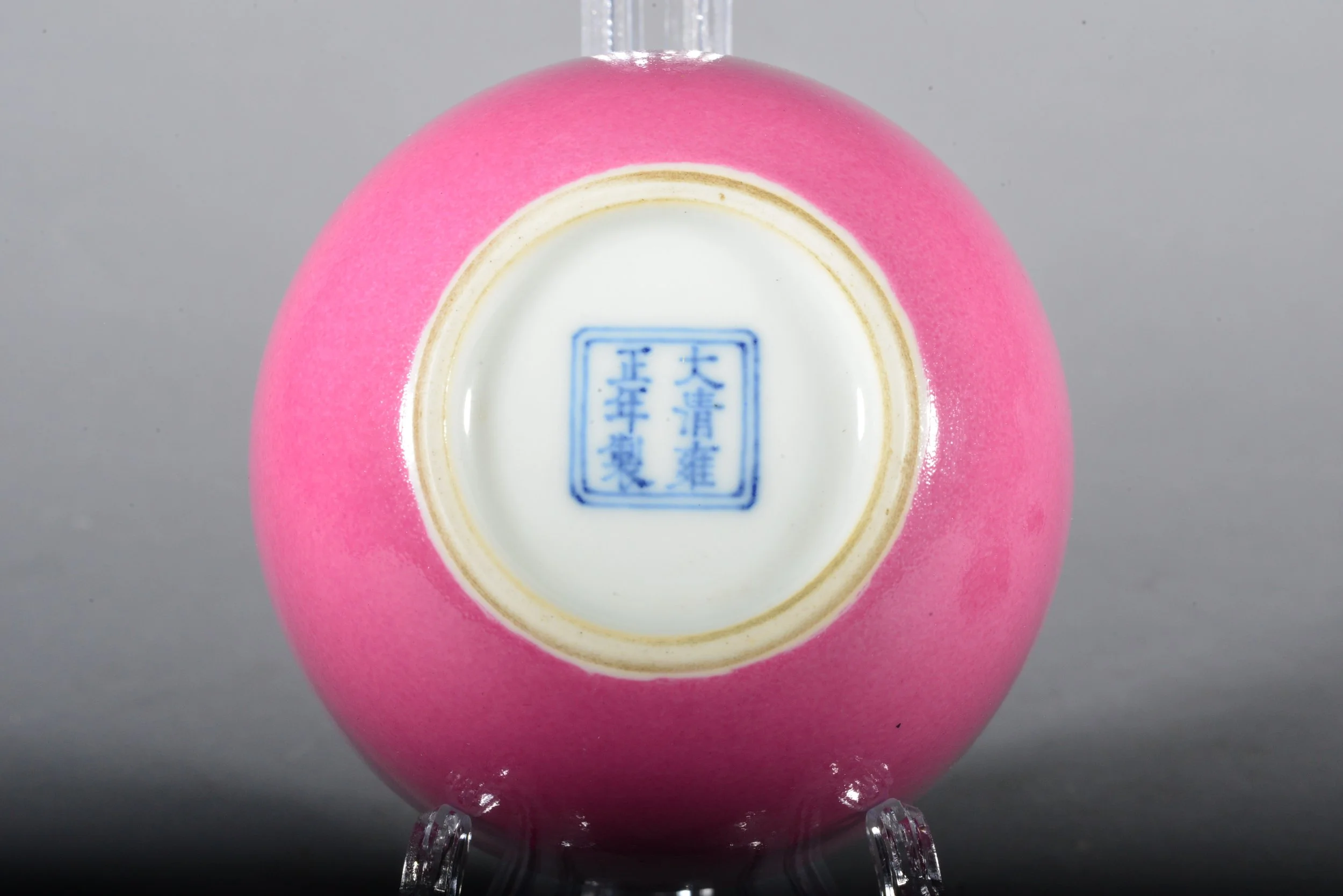 The cup covered on the exterior with a matte glaze of bright ruby-pink tone, the interior glazed white. yongzheng six-character mark in underglaze blue .